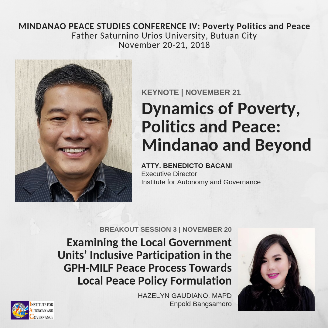 IAG is participating in the fourth installment of Father Saturnino Urios University's Mindanao Peace Studies Conference happening in Butuan City on 20-21 November 2018. This year's conference will tackle the theme "Poverty Politics and Peace".