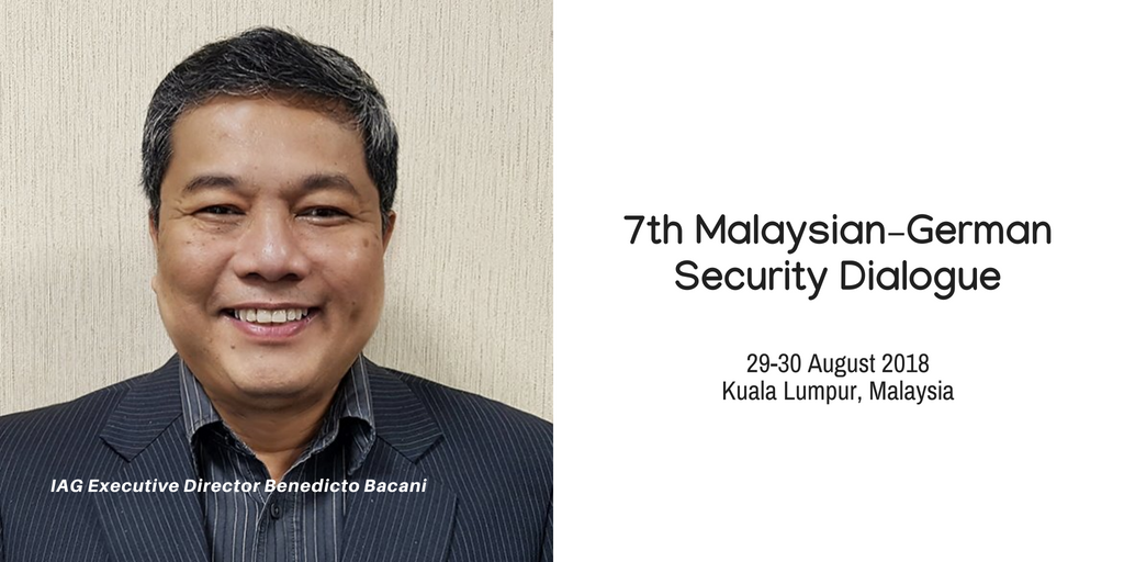 IAG Executive Director Benedicto Bacani is attending the 7th Malaysian–German Security Dialogue, a meeting of experts and decision-makers from Malaysia and Germany happening on August 29-30, 2018 in Kuala Lumpur.